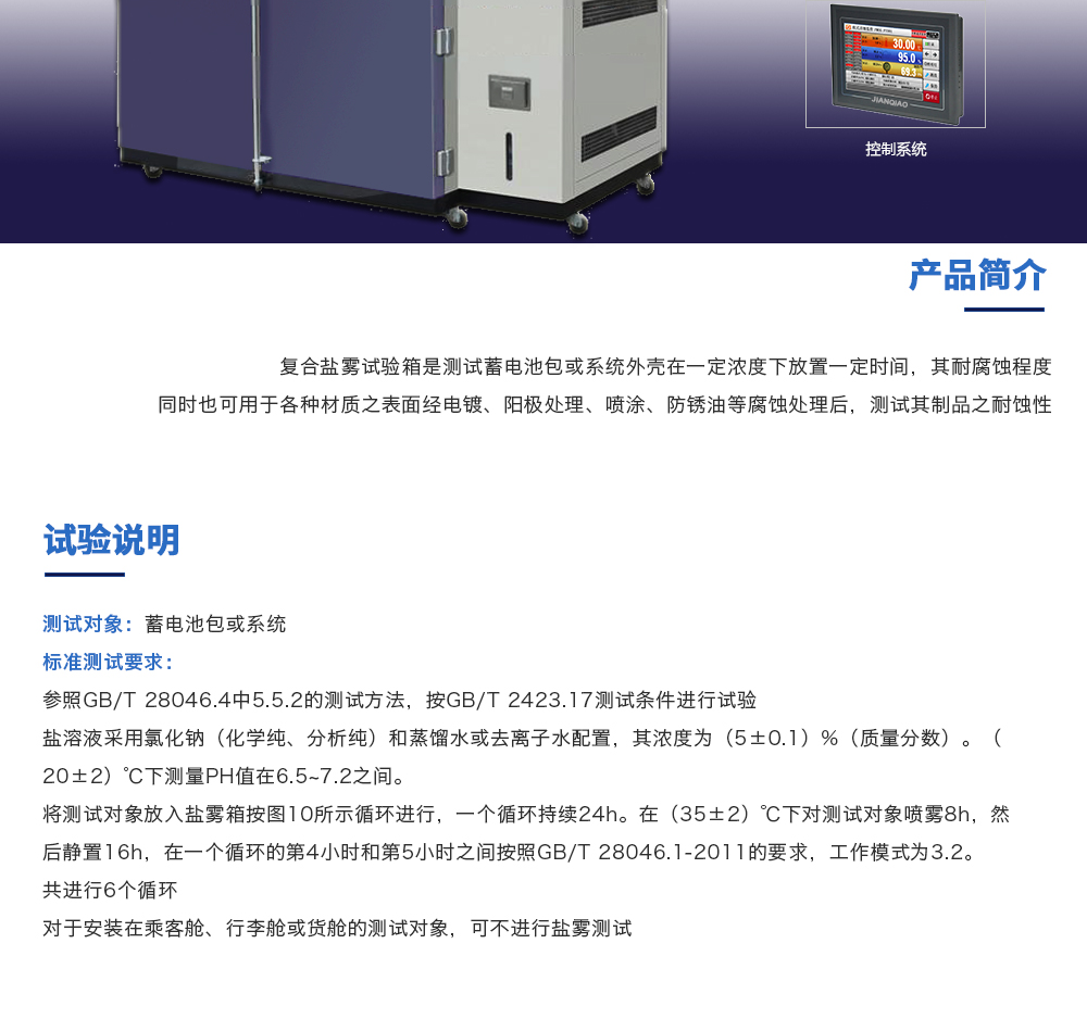 用途:復合鹽霧試驗箱是測試蓄電池包或系統(tǒng)外殼在一定濃度下放置一定時間,其耐腐蝕程度同時也可用于各種材質(zhì)之表面經(jīng)電鍍、陽極處理、噴涂、防銹油等腐蝕處理后,測試其制品之耐蝕