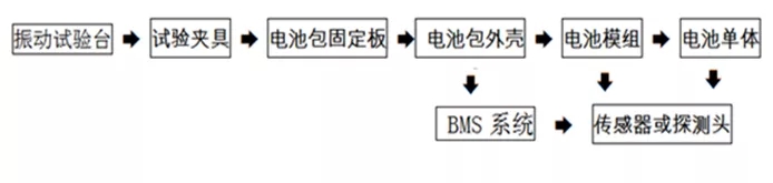 電池的振動試驗涉及到振動能量的傳播,這涉及到能量的傳播方向或路徑,試驗樣品安裝應(yīng)符合GB/T2423.43的要求,如果樣品安裝方式不當(dāng),往往會改變振動能量的真實傳播,最終影響到試驗結(jié)果。電池振動試驗的能量傳播方向和路徑見圖2:振動能量傳播示意圖。