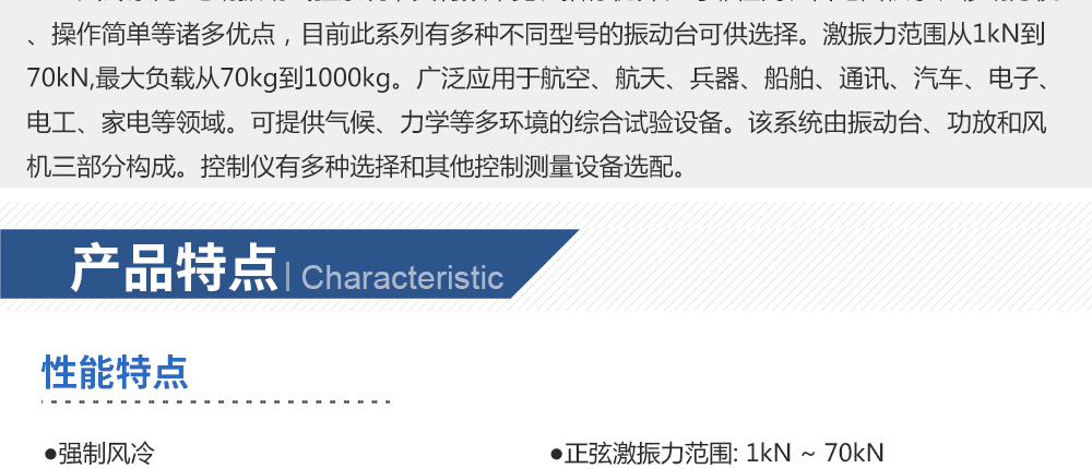 用途:風(fēng)冷電動振動系統(tǒng),推力大,承載能力強,冷卻效率高。可分別完成三軸向的正弦振動試驗、寬帶隨機振動試驗以及經(jīng)典(半正弦、梯形、后峰齒)脈沖和沖擊響應(yīng)譜試驗。