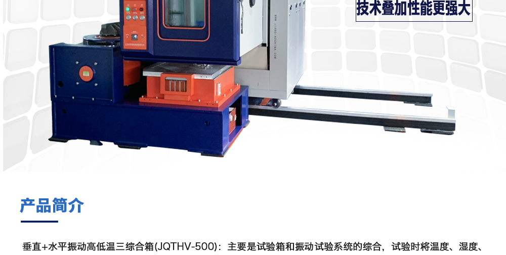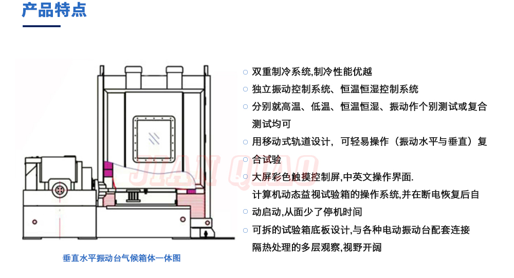 用途:垂直+水平振動高低溫三綜合箱(JQTHV-500):主要是試驗箱和振動試驗系統(tǒng)的綜合,試驗時將溫度、濕度、振動(高溫或低溫),(正弦振動或隨機(jī)振動)以及電應(yīng)力按規(guī)定的周期綜合在同一氣候試驗箱中施加到樣品上進(jìn)行溫度、濕度、振動的“環(huán)境仿真”試驗。