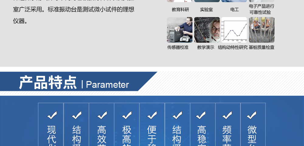 用途:小型標(biāo)準(zhǔn)振動臺具有很寬的可用頻帶,質(zhì)量小便于移動,廣泛用于加速度傳感器的校準(zhǔn)、分離和篩選微小的試件等,同時(shí)也被教育科研以及實(shí)驗(yàn)室廣泛采用。